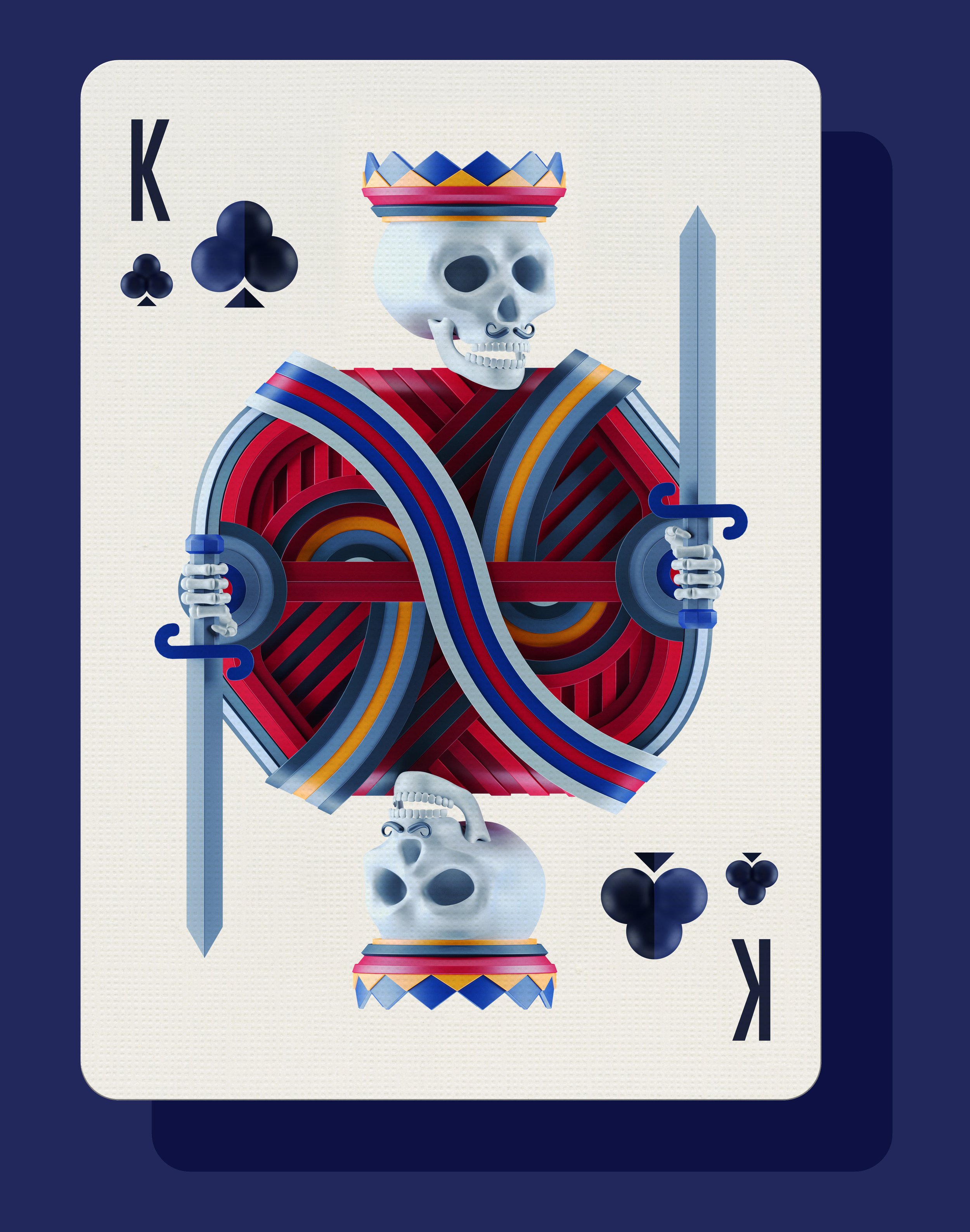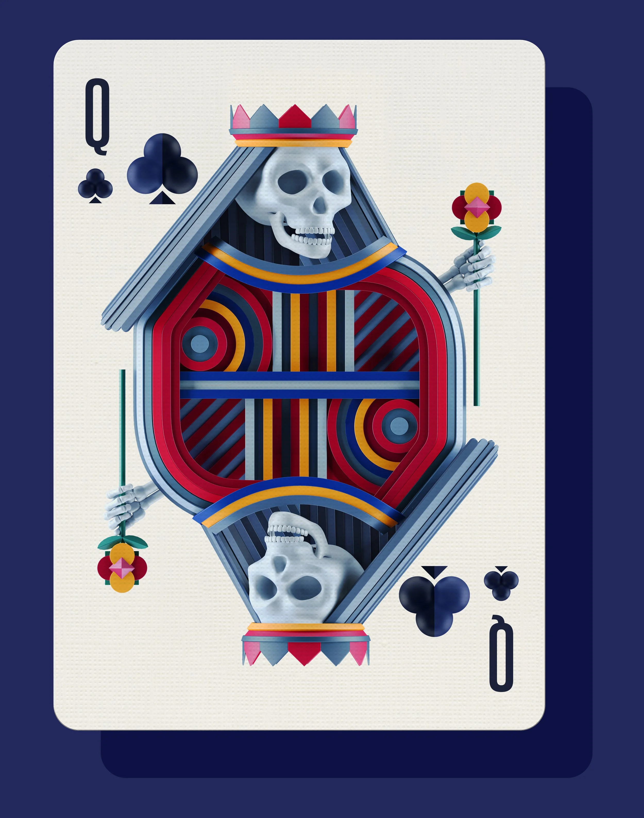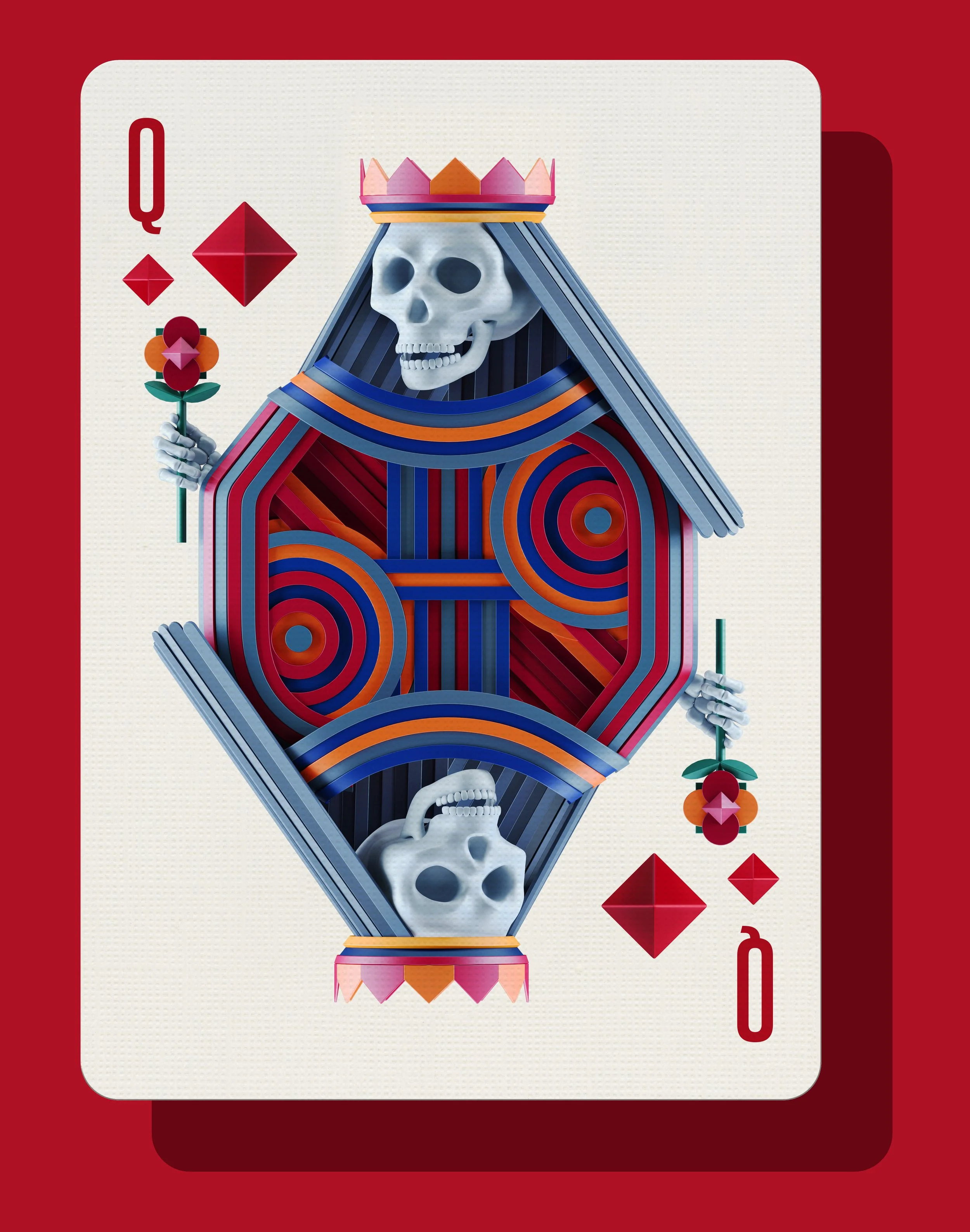 Riffle Shuffle approached me to design and illustrate a deck of playing cards based on my previous personal project titled ‘Go for it’. Evolving the original image to work in this format and further developing this style throughout the deck. Pick up a deck at riffleshuffle.com